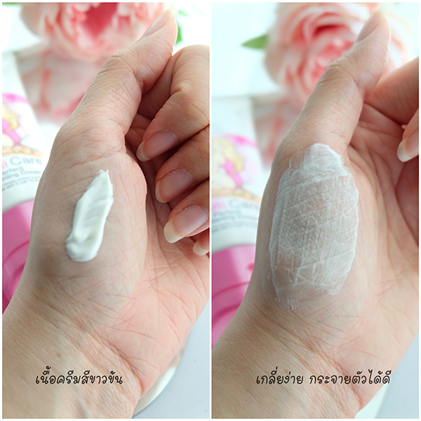เนื้อผลิตภัณฑ์จะเป็นเนื้อครีมสีขาวข้น แต่ไม่ทิ้งความเหนอะหนะบนผิวหลังจากทาเลย ซึ่งเวิร์คมาก