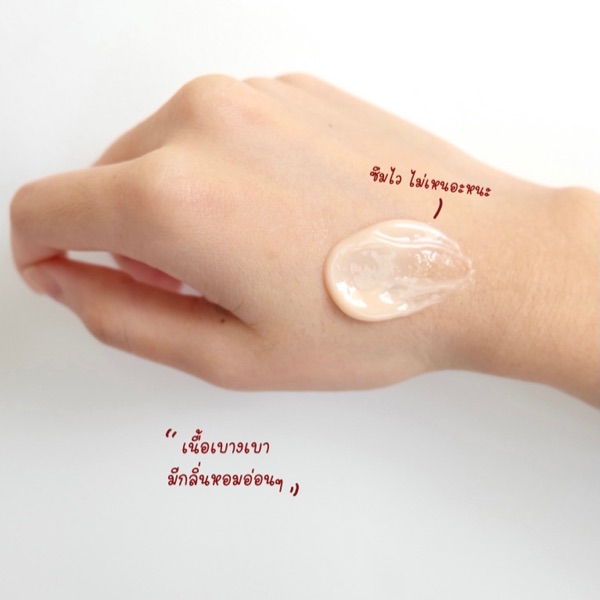 เนื้อครีมสีส้มอ่อนๆ เนื้อครีมบางเบา และที่ชอบคือ เนื้อเค้ากึ่งๆเนื้อเจล ซึมเข้าผิวไวมากก