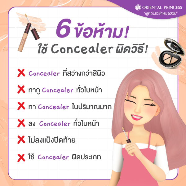 1. Concealer เฉดสีที่สว่างกว่าสีผิว เป็นสิ่งที่ไม่ควรทำเป็นอย่างยิ่ง เพราะนอกจากจะไม่ช่วยปกปิดอะไรแล้ว ยังไปช่วยเสริมร่องรอยให้โดดเด่นเป็นสง่ายิ่งขึ้นไปอี๊ก