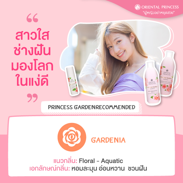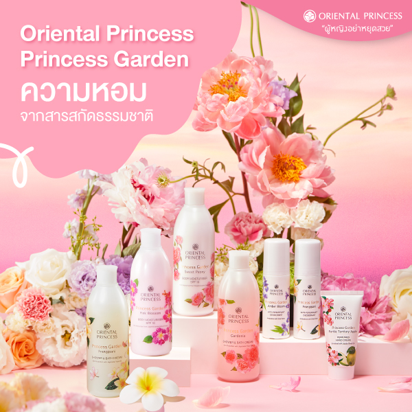 ด้วยความหลงไหลในมนต์สะกดแห่งความหอมจากธรรมชาติ และอยากจะแบ่งปันความหอมเหล่านี้ให้ผู้หญิงทุกคนได้สัมผัส Oriental Princess Princess Garden จึงเป็นชุดผลิตภัณฑ์ ความหอมที่มาพร้อมการปรนนิบัติดูแลผิวกายจากสารสกัดธรรมชาติ ที่ช่วยฟื้นฟูสภาพผิวให้อิ่มฟู และนุ่มเนียนละมุน มอบผิวกายที่หอมกรุ่นอ่อนโยนละมุนติดตรึงผิวกายยาวนาน