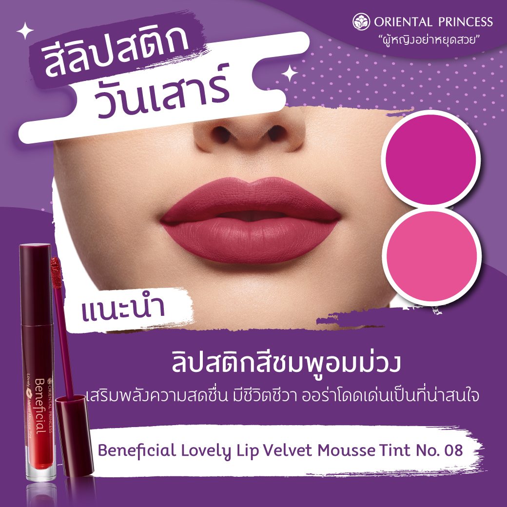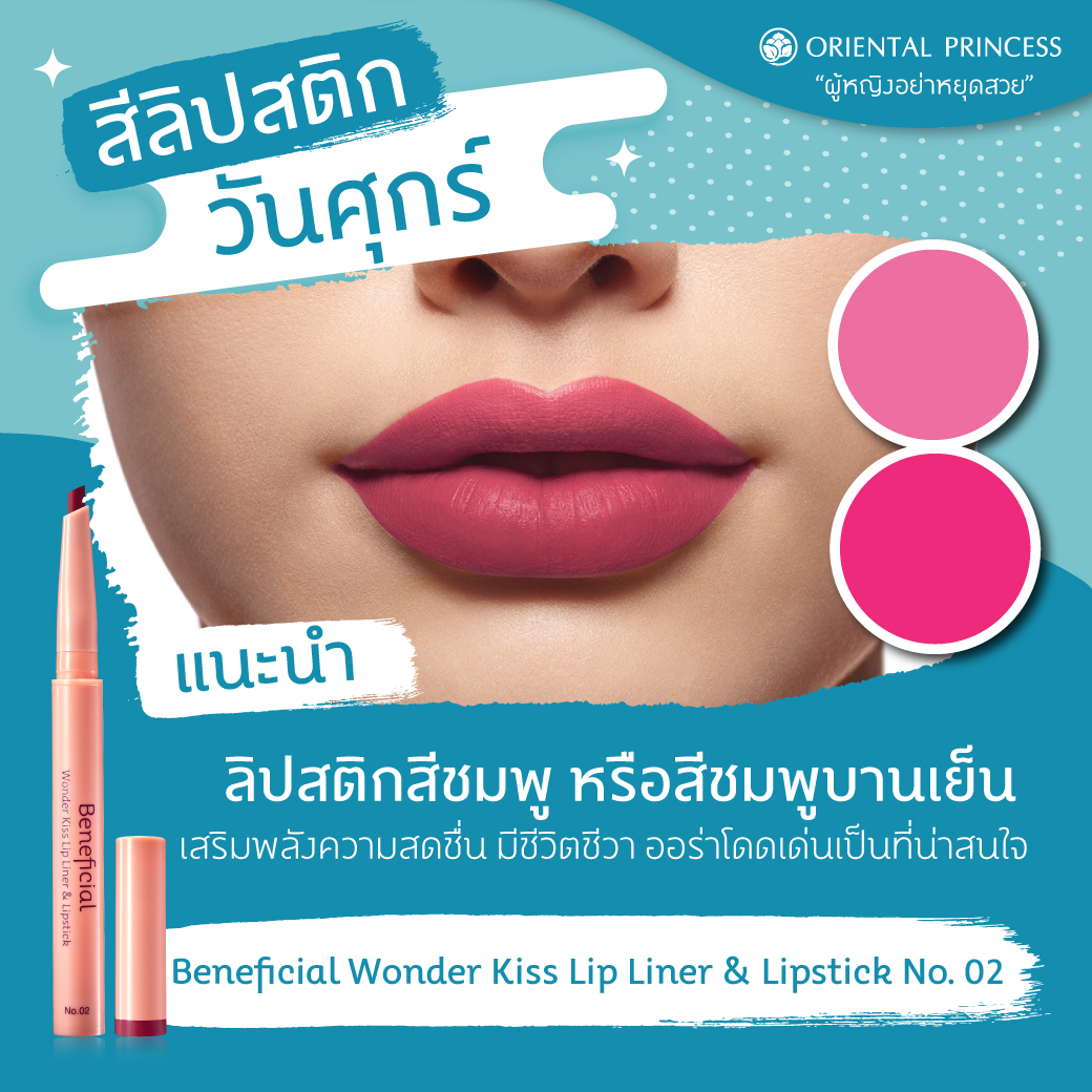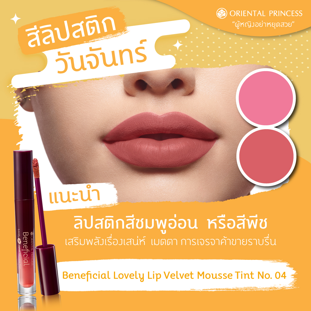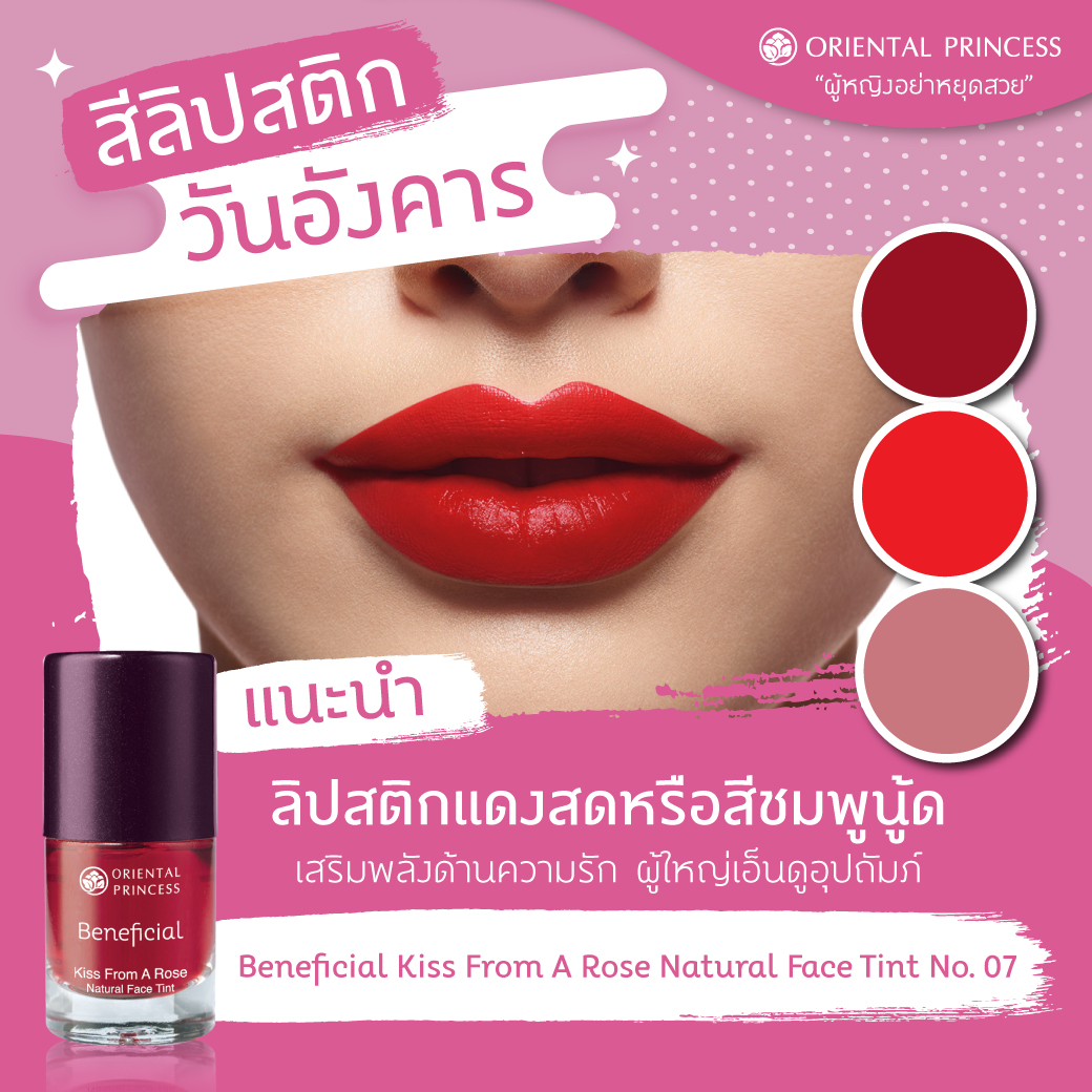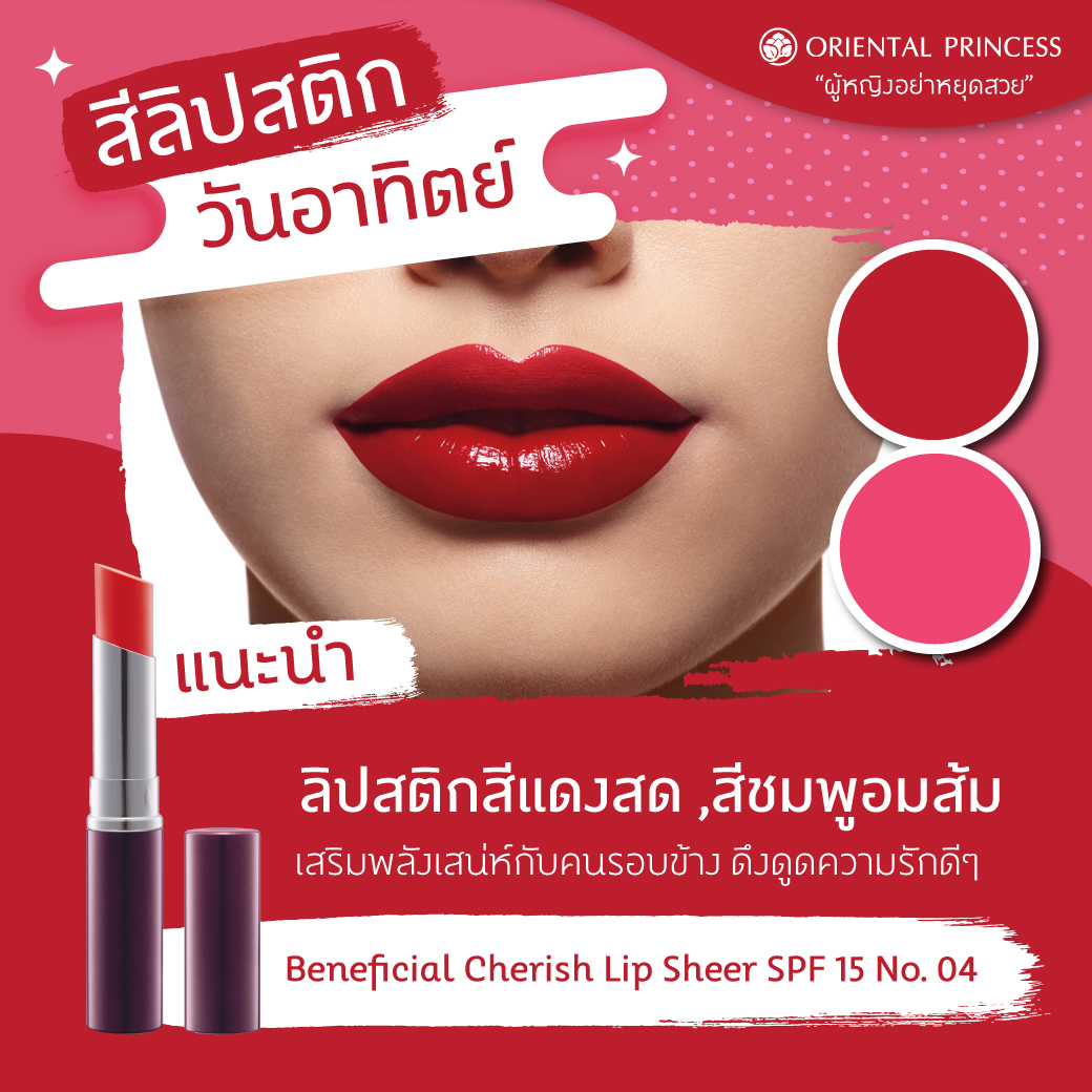 แนะนำ : ลิปสติกสีแดงสด หรือแดงมะเหมี่ยว ,สีชมพูอมส้ม