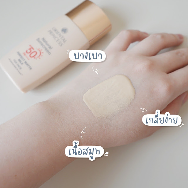 โปรดักส์ที่บอกคือ Oriental Princess Natural Sunscreen Perfect Matte Milk SPF 50+ PA+++ “กันแดดสีเนื้อผิวแมตต์” ตัวนี้เคลมเลยว่าเป็นกันแดดเนื้อนํ้านมพอทาไปซักพักเค้าจะเซ็ตตัวเป็นเนื้อแมตต์ เนื้อเค้าจะบางเบา เกลี่ยง่าย และช่วยปกปิดรอยดำรอยแดงได้ด้วย คือง่ายๆ ใช้แทนรองพื้นก็ได้ค่ะ ในกรณีที่ไม่ได้มีปัญหาผิวมาก หรือใช้เป็นเมกอัพเบสก็ได้ เพราะน้องช่วยปรับ ให้สีผิวเรียบเนียนสม่ำเสมอ ง่ายต่อการลงเมกอัพอื่นๆต่อ