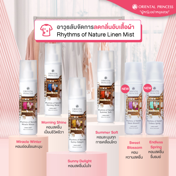 - Rhythms of Nature Linen Mistสเปรย์น้ำหอมสำหรับสื้อผ้า  และด้วยส่วนผสมอันบริสุทธิ์จากสารสกัดธรรมชาติ  และน้ำหอมคุณภาพสูงจึงสามารถใช้ได้กับทุกเนื้อผ้า  ช่วยลดปัญหาเสื้อผ้ามีกลิ่นอับได้ทันทีที่ใช้  เพิ่มเสน่ห์ด้วยกลิ่นหอมสดชื่นในทุกจังหวะของการเคลื่อนไหว  มีให้เลือกถึง 6 กลิ่นหอมชื่นรื่นรมย์จากธรรมชาติ
