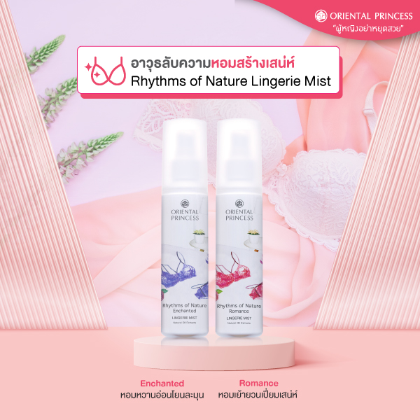 Rhythms of Nature Lingerie Mist สเปรย์น้ำหอมสำหรับชุดชั้นใน  สูตรอ่อนโยนต่อผิวหนัง   ผสานด้วยความหอมละมุนจากสารสกัดบริสุทธิ์จากธรรมชาติ  เพิ่มเสน่ห์ด้วยกลิ่นหอมชวนค้นหาในทุกจังหวะของการเคลื่อนไหว  กับ  2  กลิ่นหอมจากดอกไม้ตะวันออก