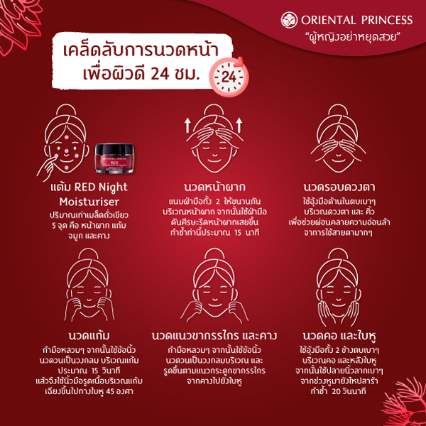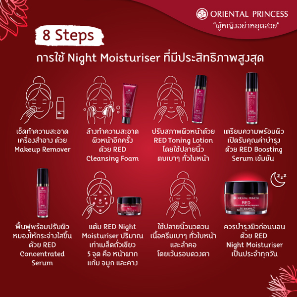 - แต้ม RED Night Moisturiser ปริมาณเท่าเมล็ดถั่วเขียว 5 จุด ( หน้าผาก แก้ม จมูก และคาง)